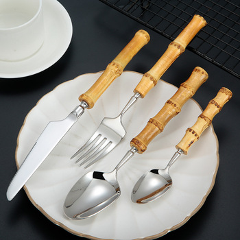 Productos ecológicos, juego de cubiertos de plata de lujo con mango de bambú para fiesta, barra de acero inoxidable sólido, juego de cubiertos de proceso de torno CNC